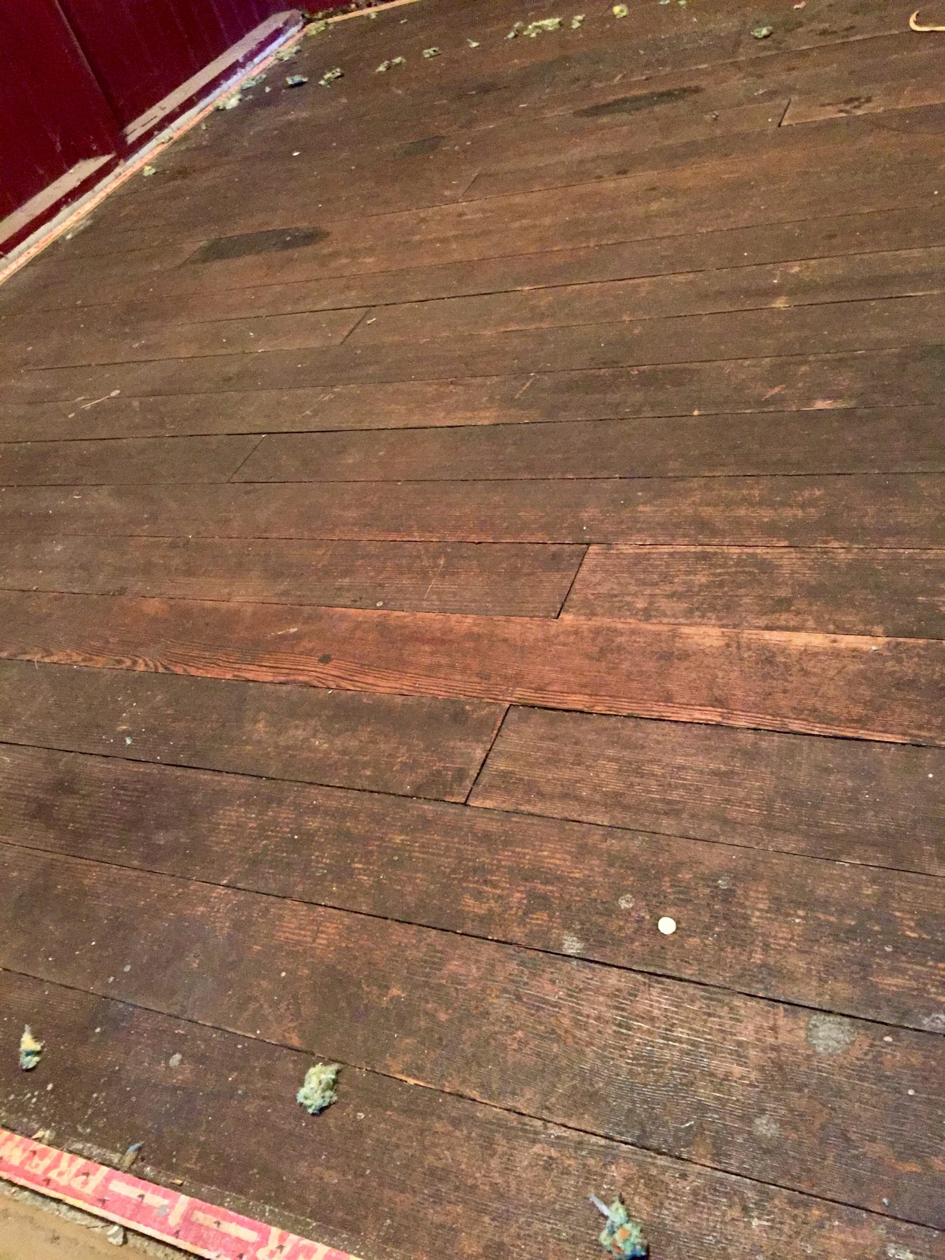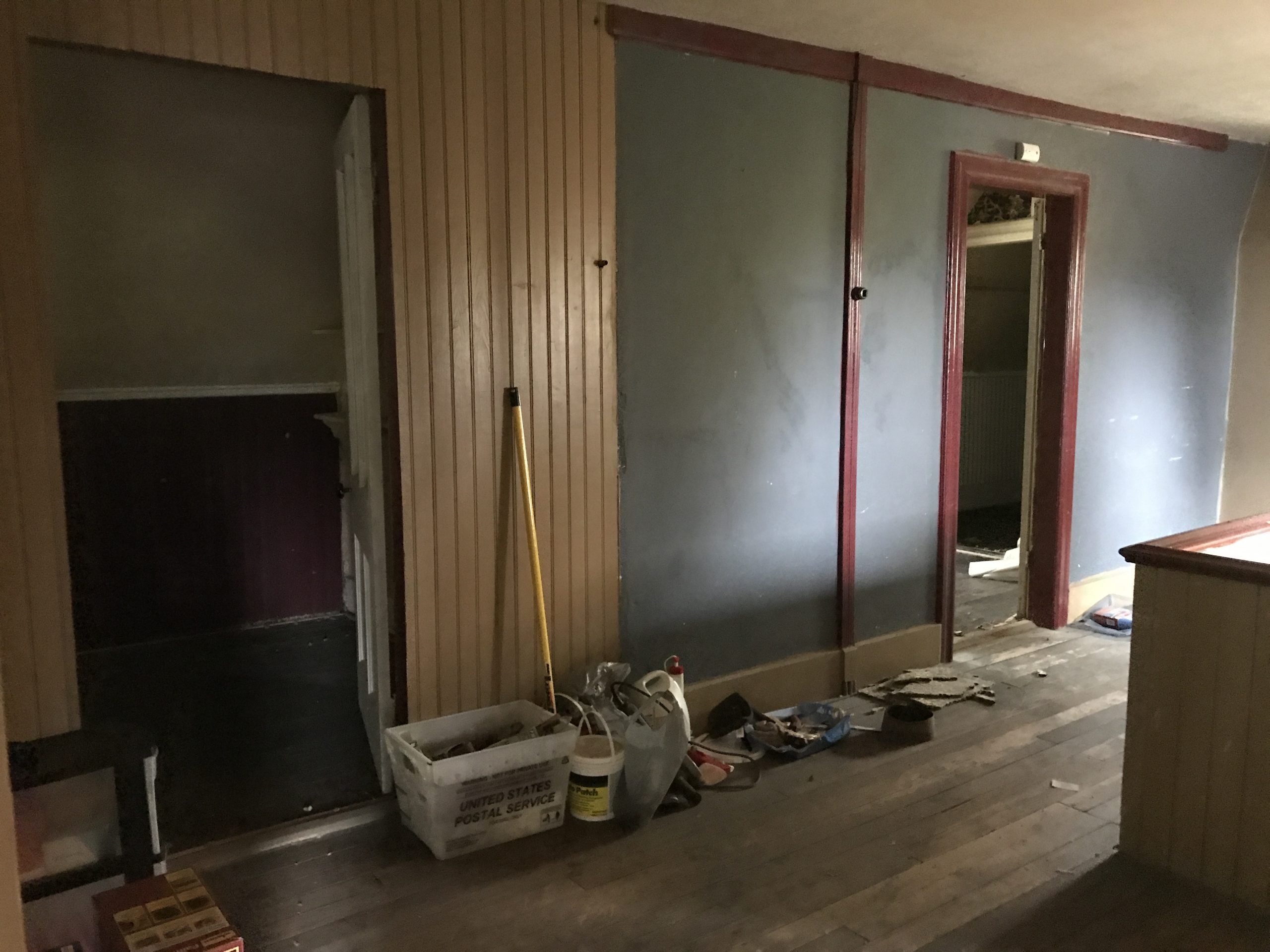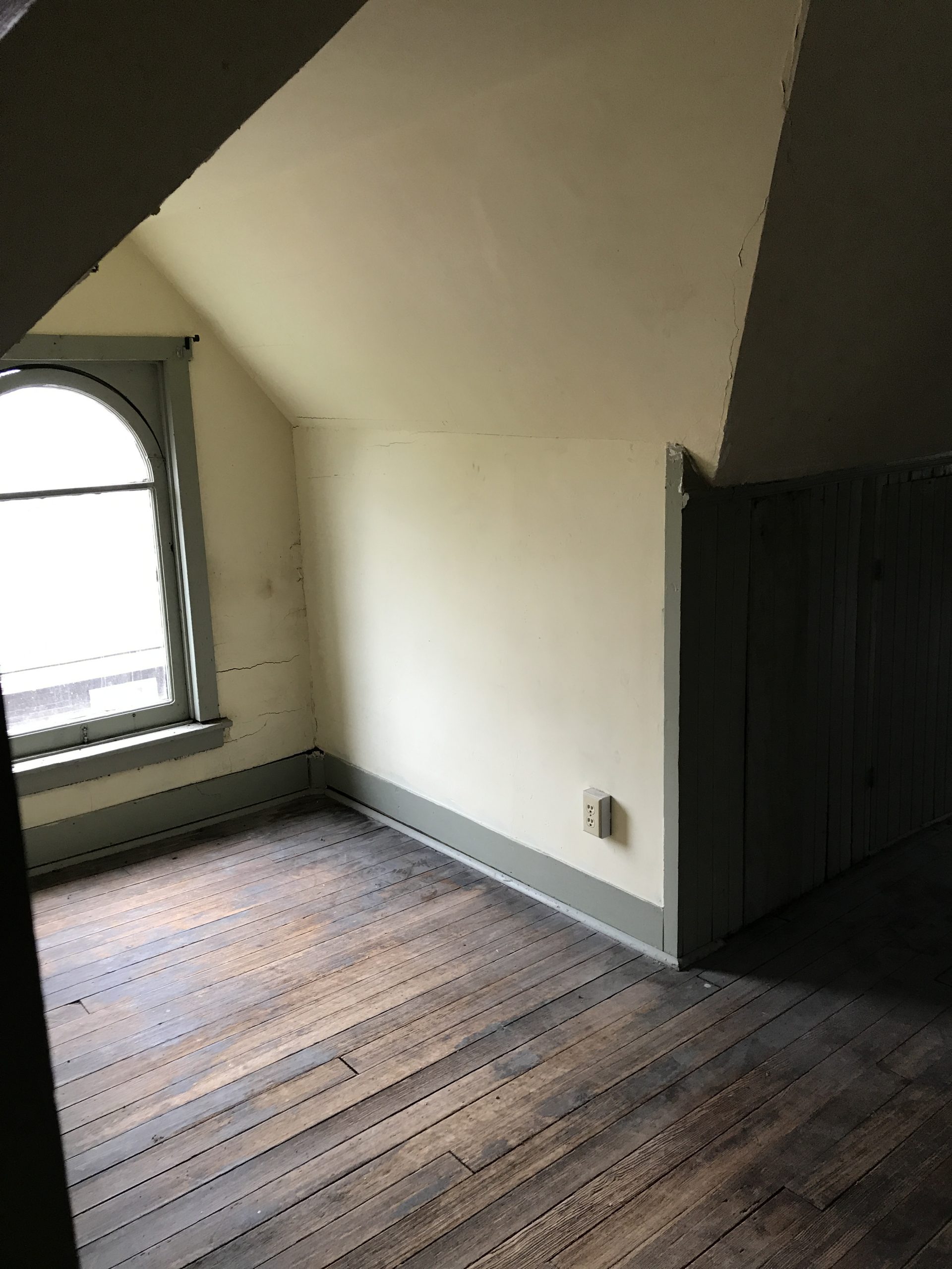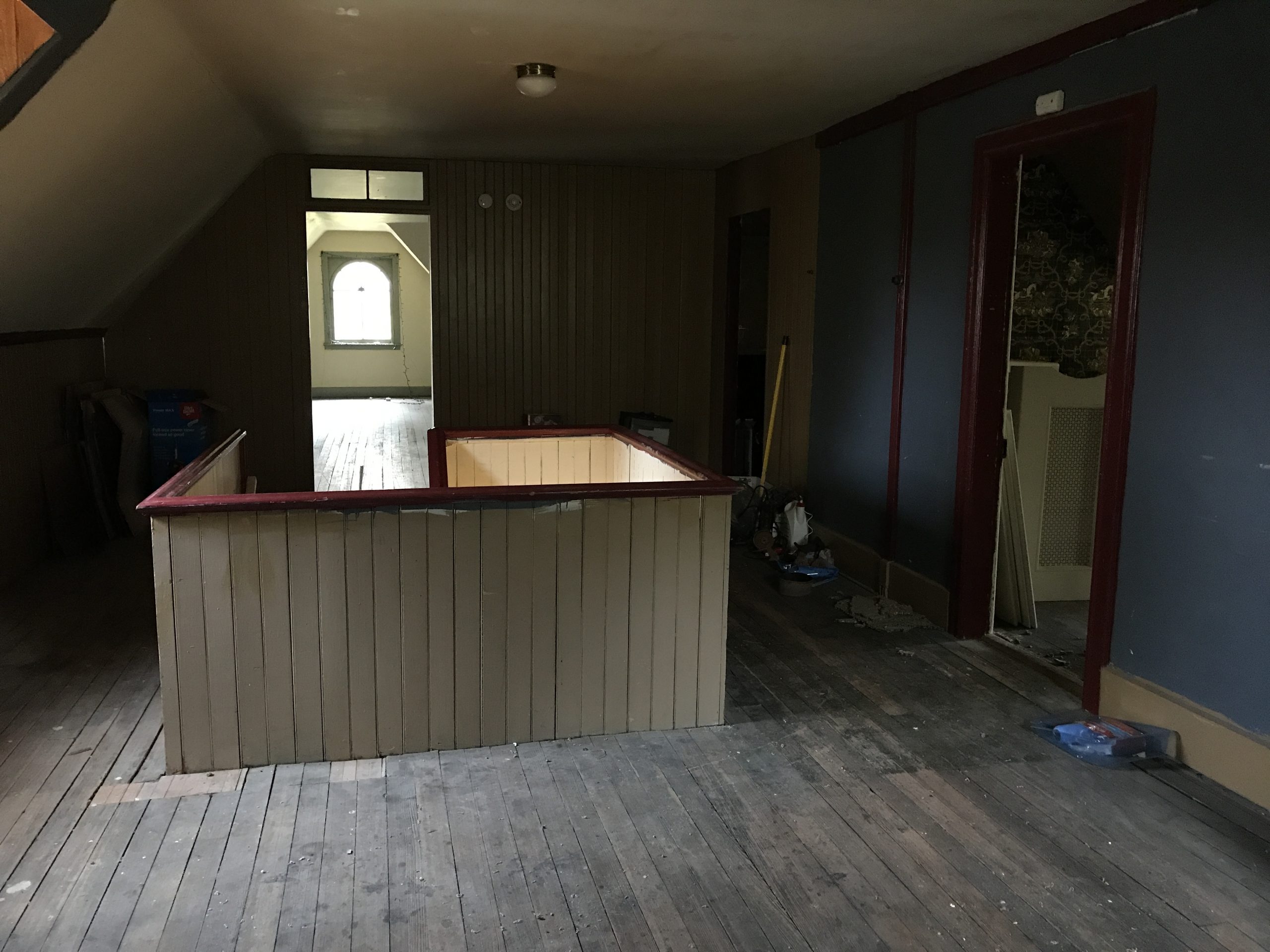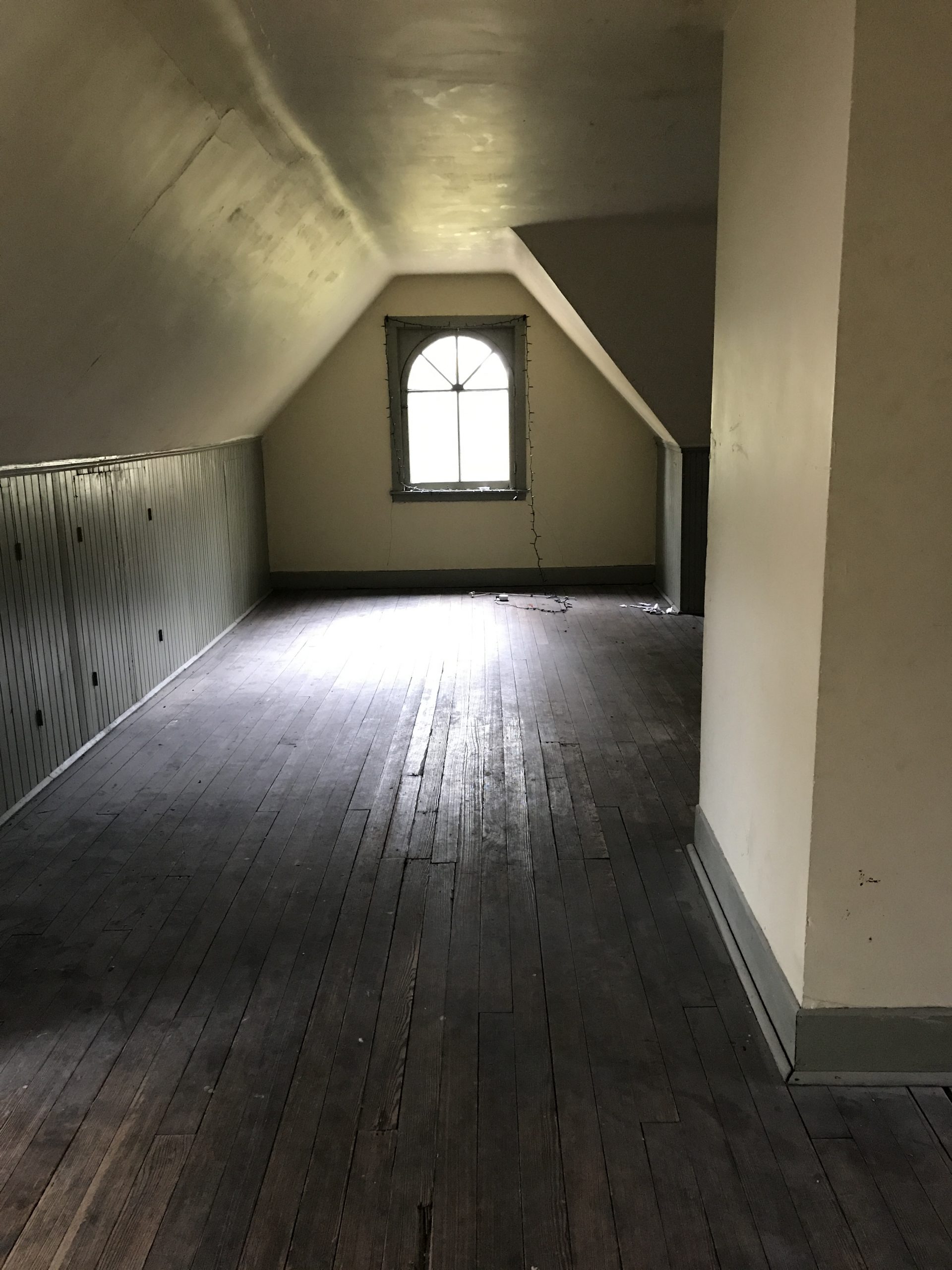 There are two clearly defined spaces. Going straight forward from the top of the stairs you’ll enter what we believe used to be a ballroom. The floors are original and HAVE NOT BEEN PAINTED. That fact alone makes me want to break out in dance! All they’ll need is a good sanding, some very basic patch repairs, and a nice glossy poly sheen.