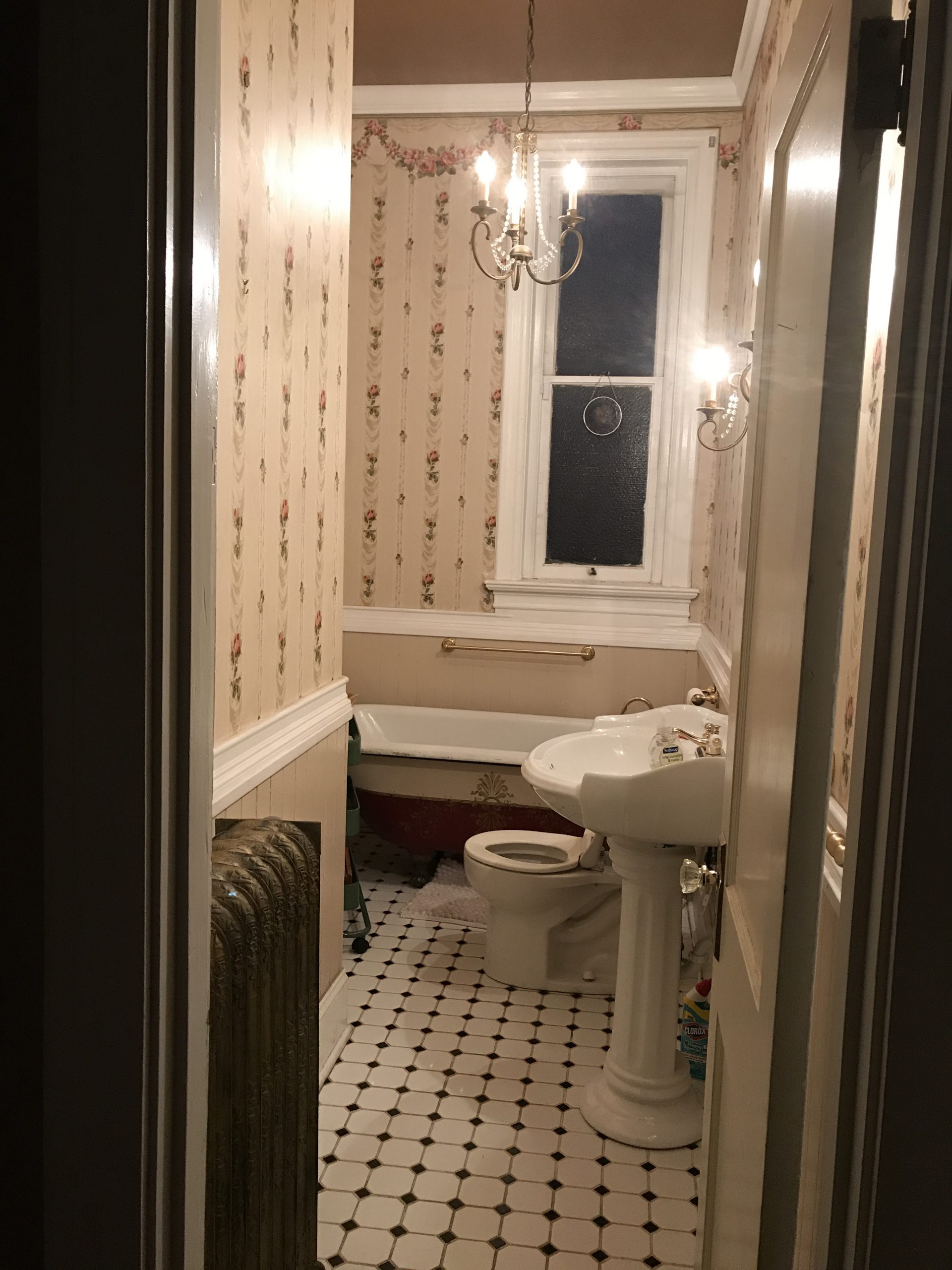 I felt like perhaps the art-deco mirror would be fitting seeing as this wasn’t originally a bathroom. See, when the Brick and Maple was built in 1887, they didn’t have indoor plumbing! This room was originally used as a second hallway connecting the dining room with the kitchen. When the bathroom was added sometime in the 30s-40s, the tub was placed and the walls were built around it. It’s a good thing I love it so much because that tub literally CAN’T go anywhere as it won’t fit through the door!