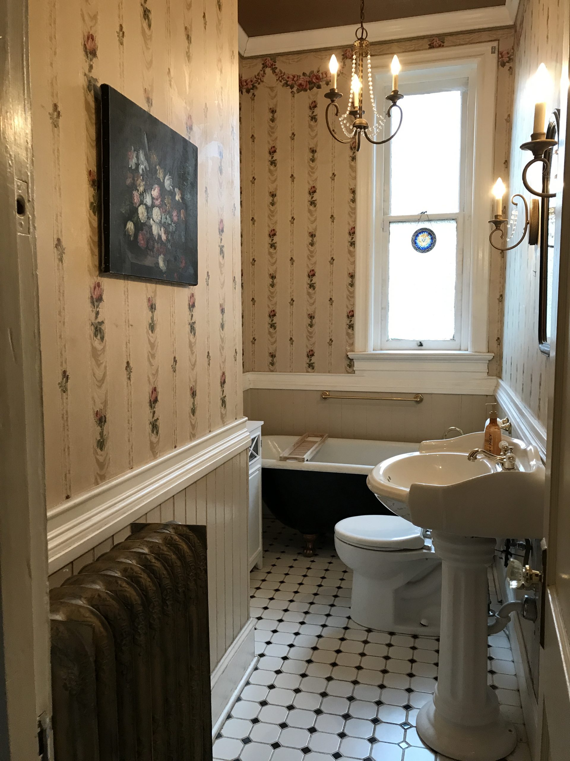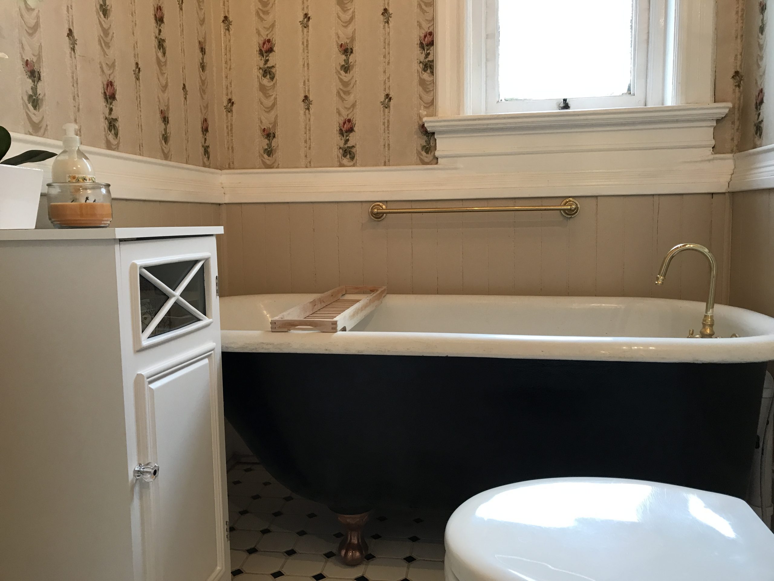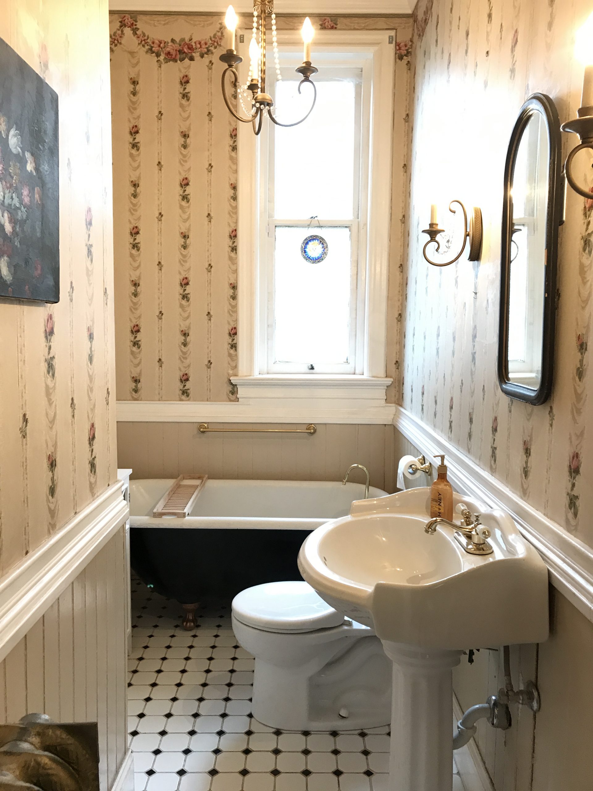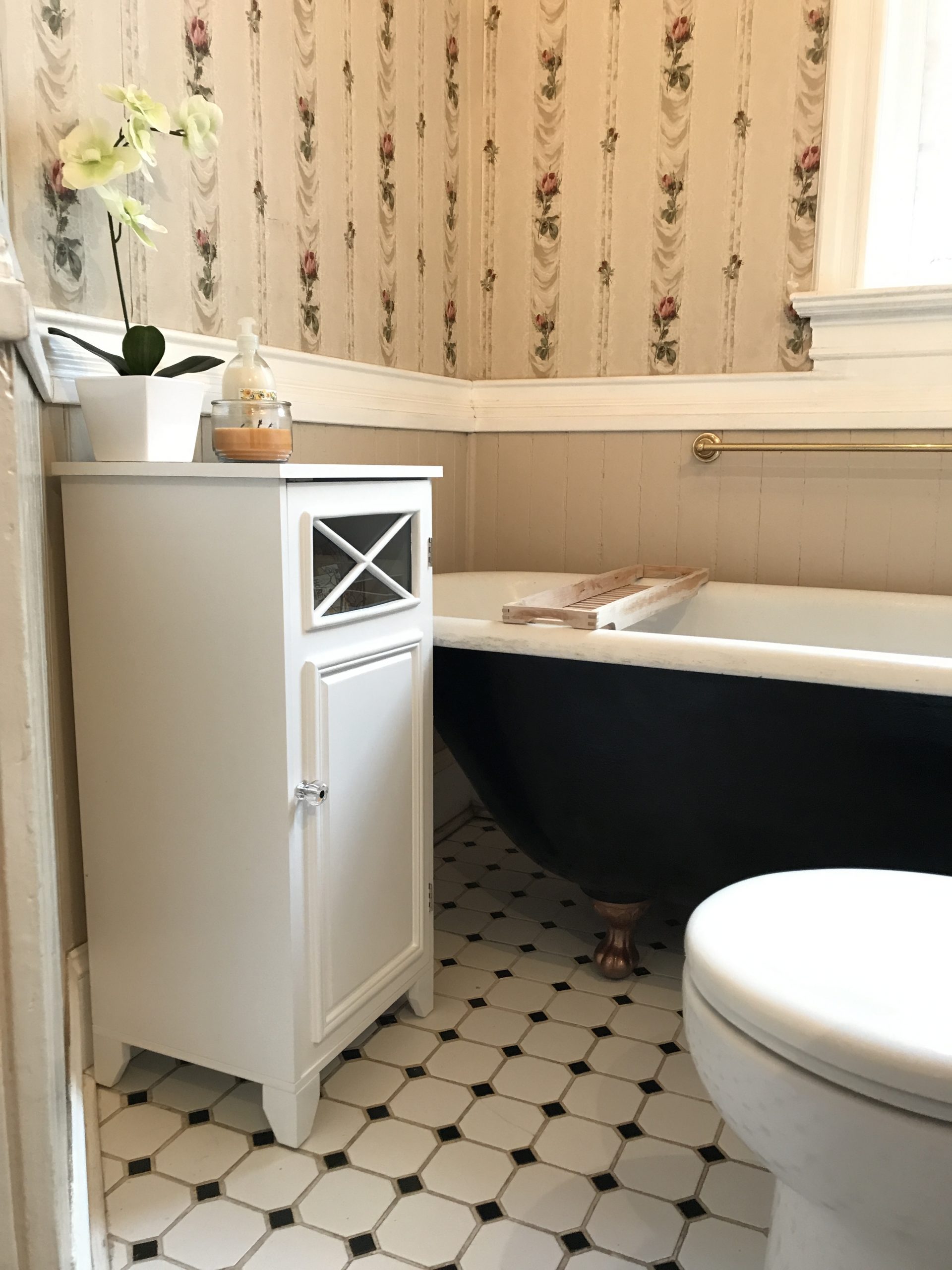 As you can see, it was just… a lot. Between the floral wallpaper, the decal on the tub, the black and white floor, and (unseen) the gold pressed tin ceiling, I felt like it just needed to be streamlined. I’m really happy with the final product!