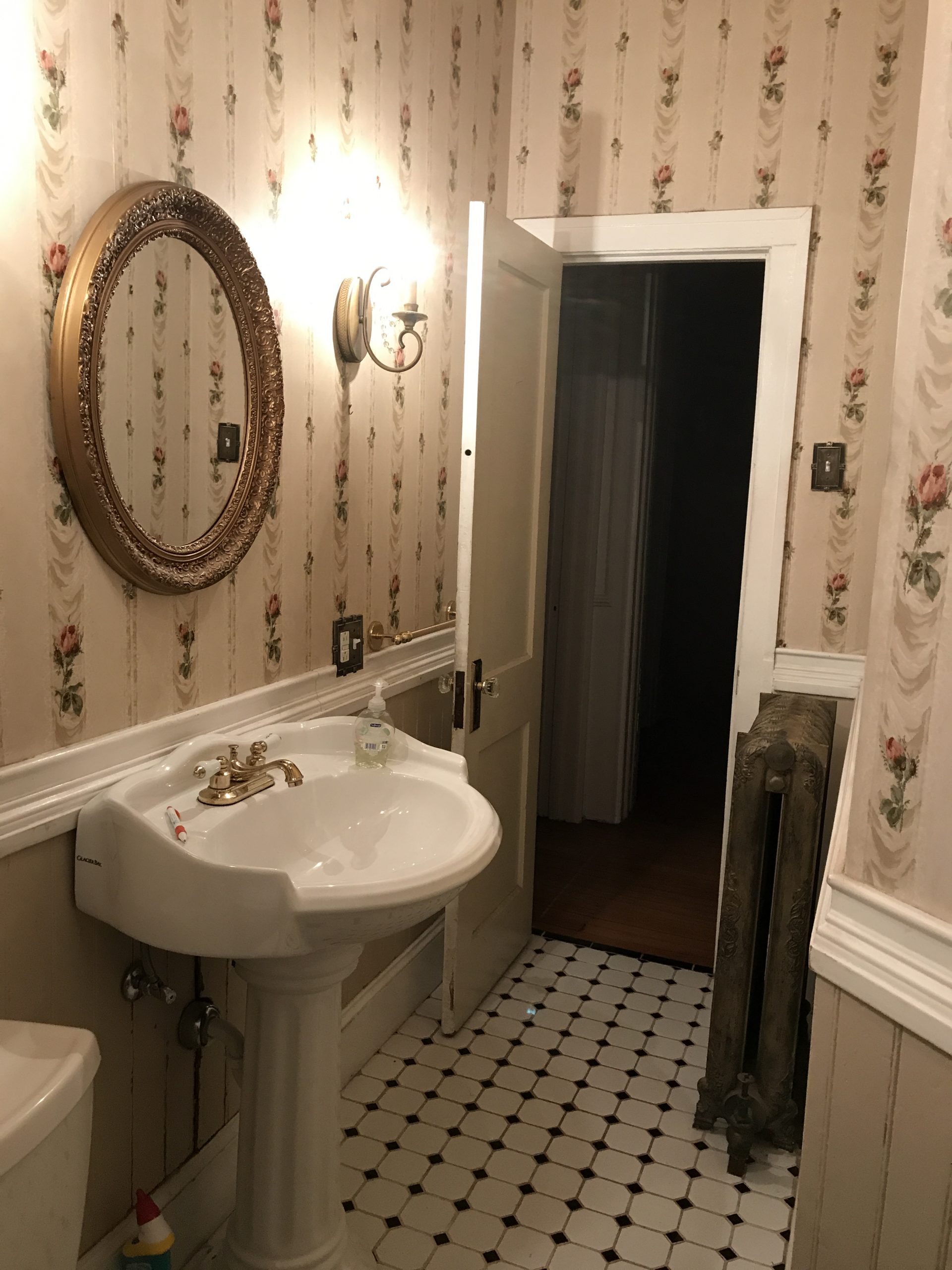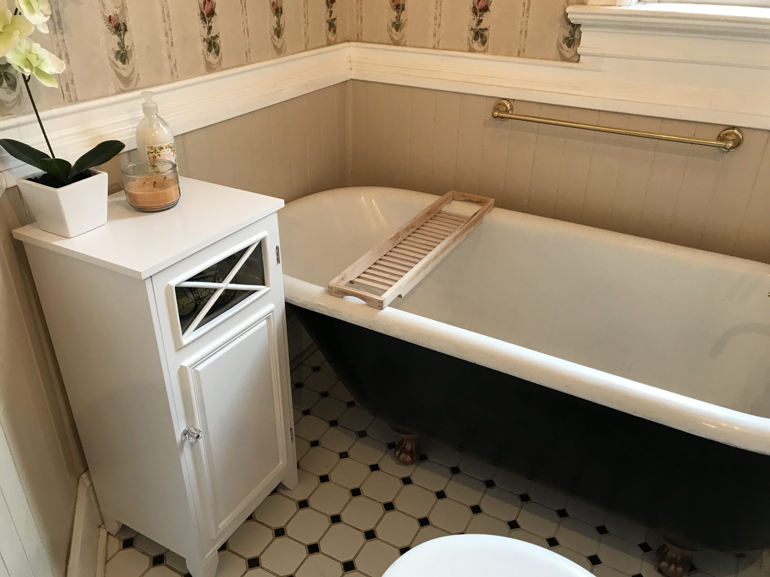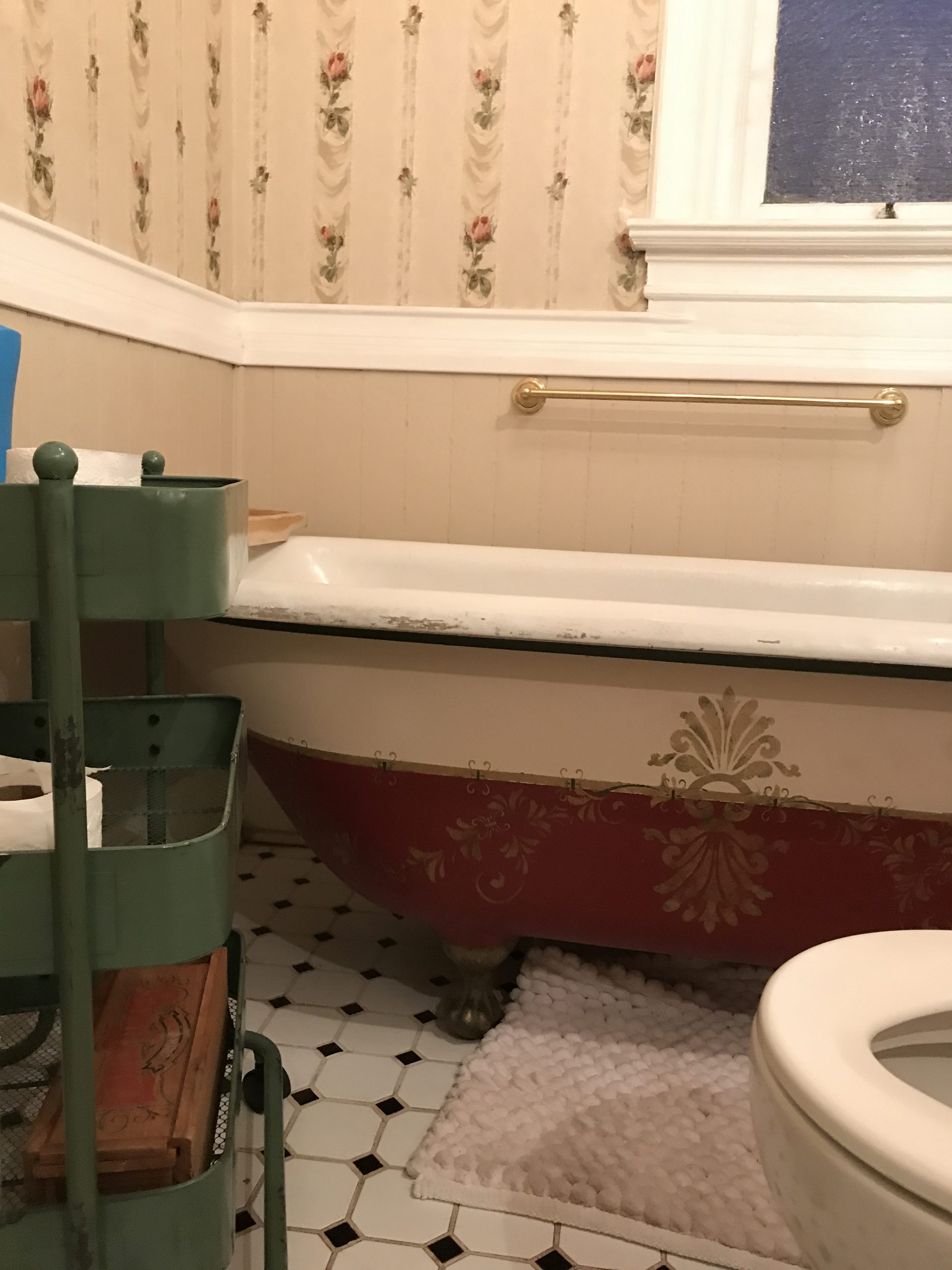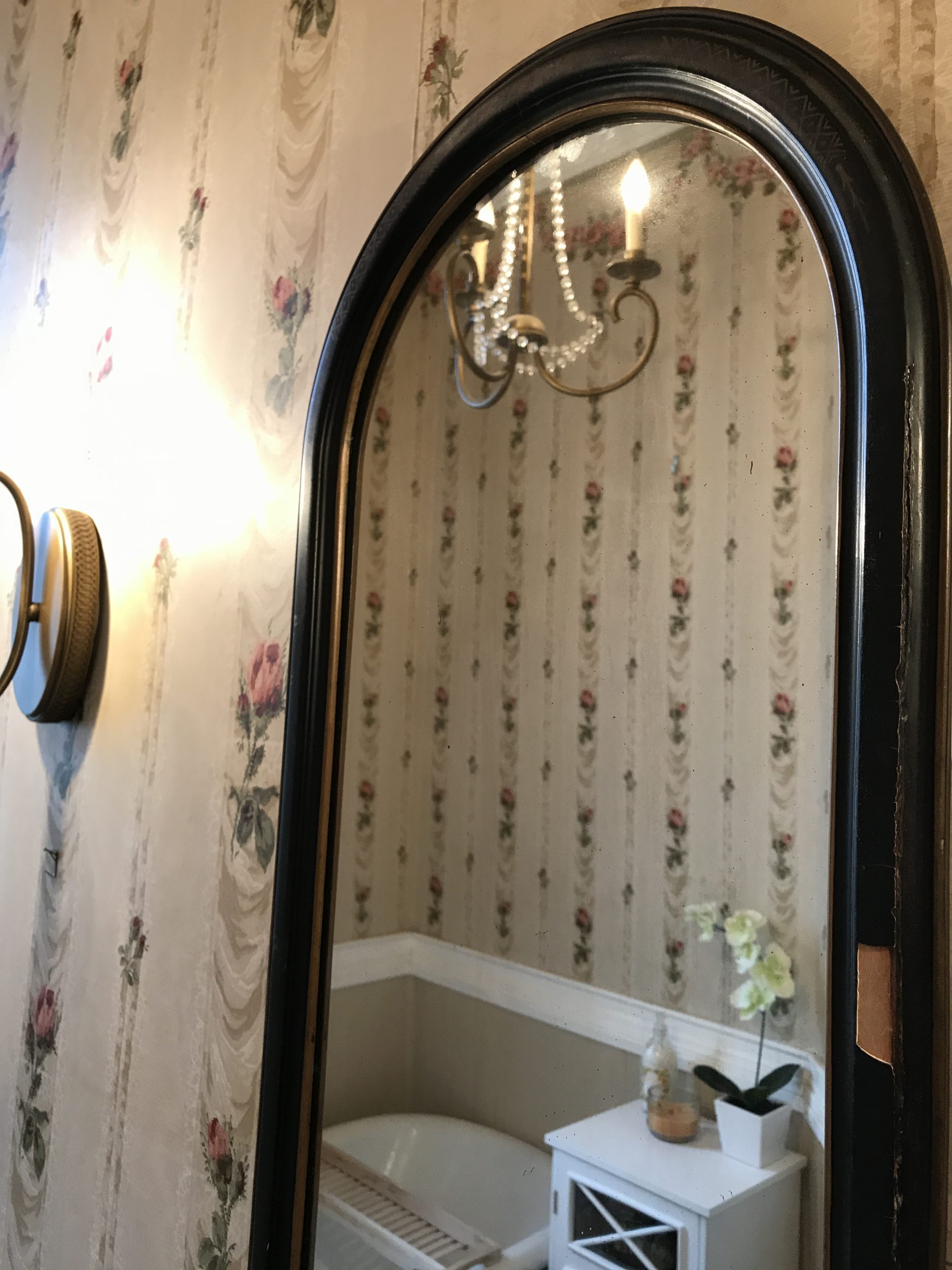 As you can see, it was just… a lot. Between the floral wallpaper, the decal on the tub, the black and white floor, and (unseen) the gold pressed tin ceiling, I felt like it just needed to be streamlined. I’m really happy with the final product!
