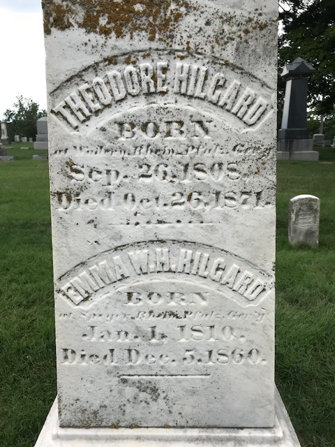Walnut Hill Cemetery in Belleville, IL is the eternal resting place of many of Belleville’s original families, including the Hilgards. Theodore and Emma Hilgard were Elise’s parents– you’ll remember Elise as the matriarch of the family who originally lived in our home. She even named her first two children after her parents and used Hilgard as a middle name for most of her 8 children.