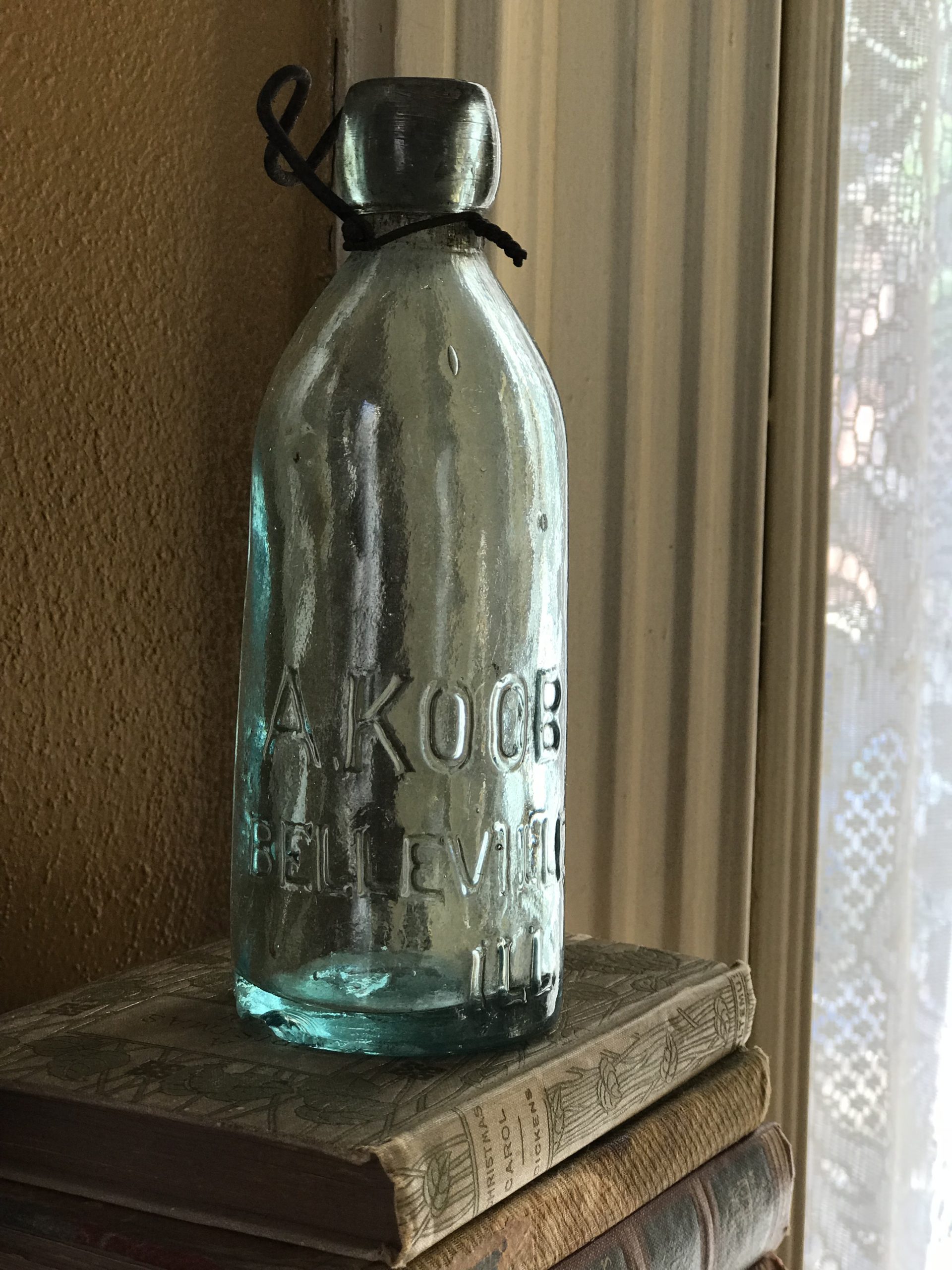 In doing research (mainly through this edoc from the Society of Historical Archaeology), we discovered this is an old soda bottle from the Belleville Glass Company. The A. Koob (and A.K initials on the bottom) stand for August Koob Soda Works.