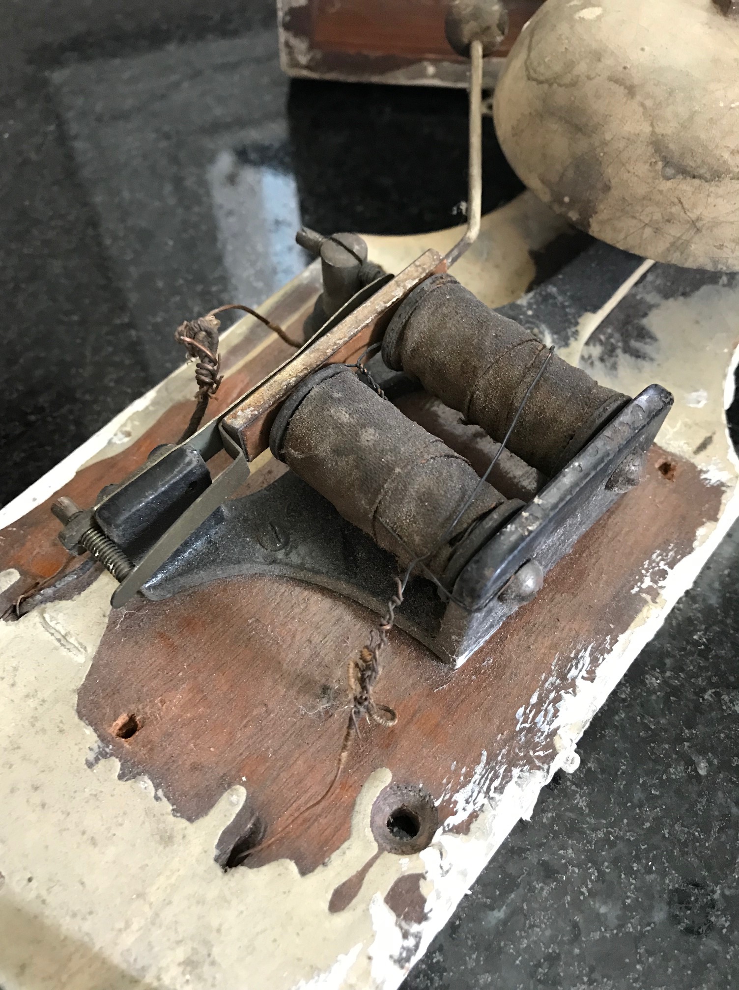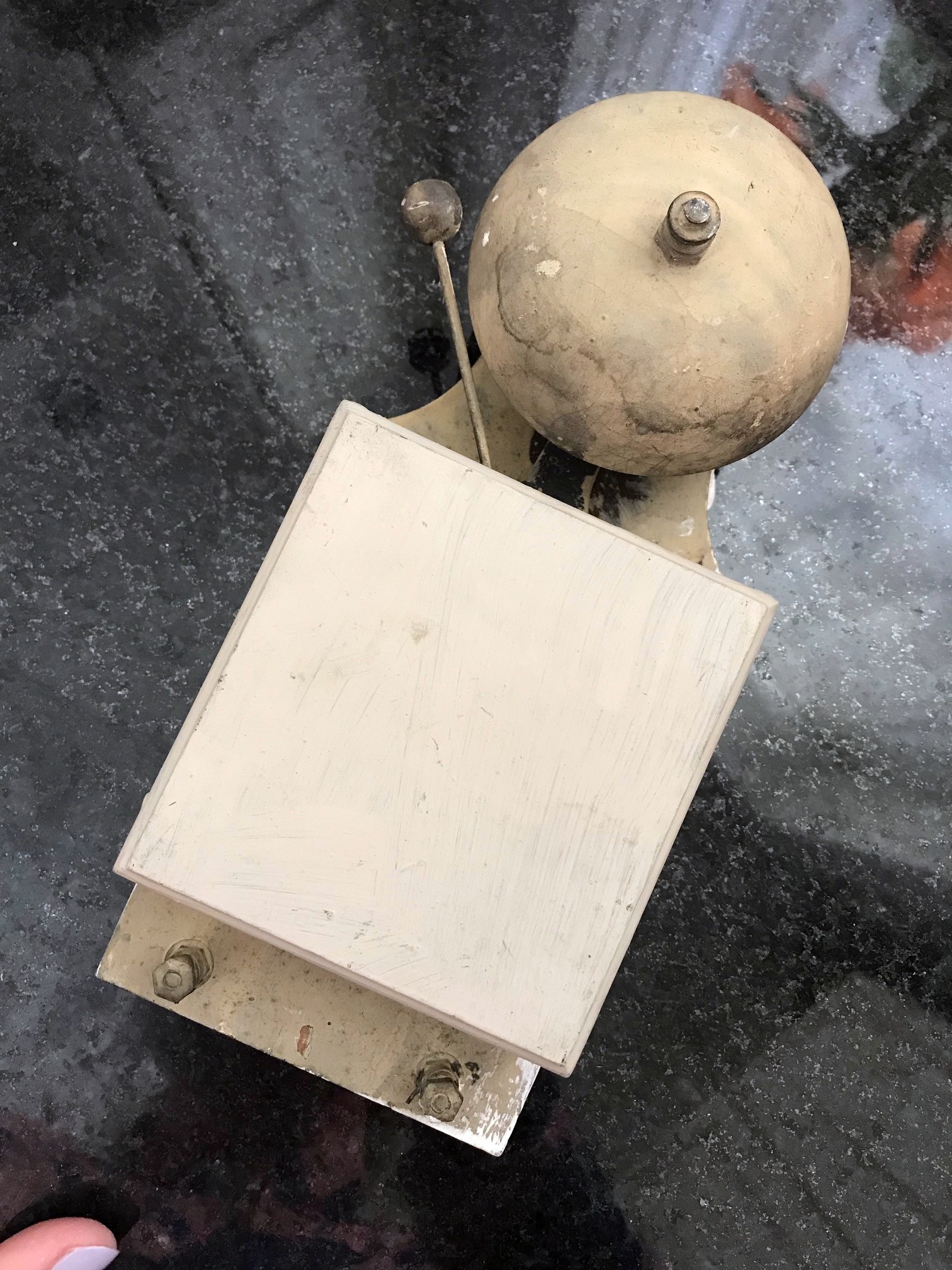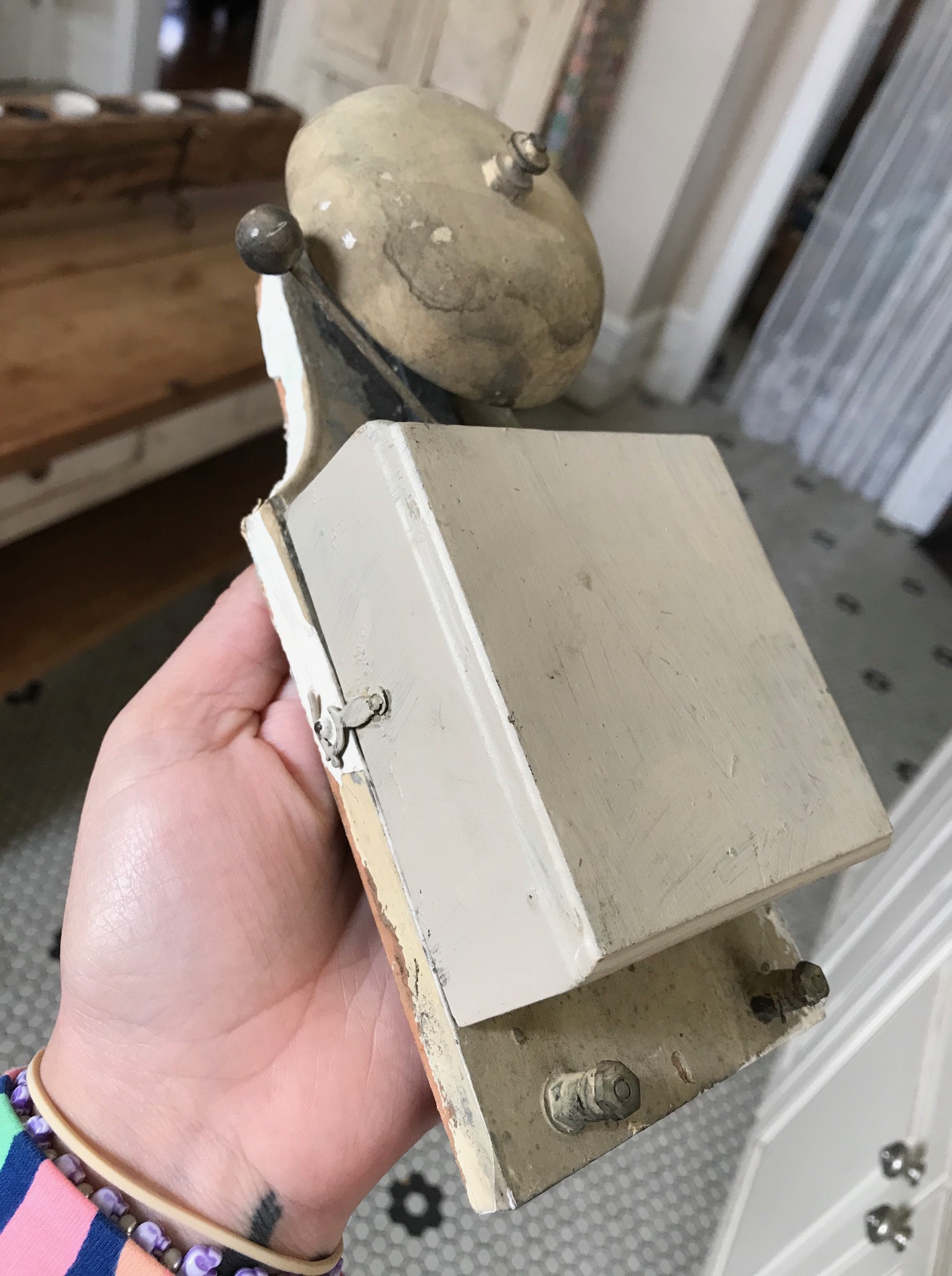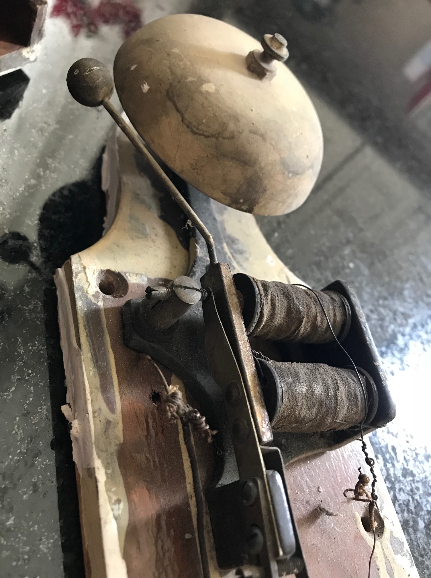 We fully believe this doorbell is original to the home’s construction. (It looks almost identical to this image I found on Wikipedia of an 1884 doorbell from Budapest.) 640px-Lakáscsengő_-_Andrássy_út_94_szám_II._emelet_2_ajtószám_(1)Simple clapper doorbells work through high-school science. When you push the button, you complete an electrical circuit. This “push-to-make” switch powers a hammer that rings a bell. My husband (you know, the one I previously mentioned who just knows how to do everything? Yeah. Him.), he totally got this thing to work while tinkering with it down in the basement. We may wrap our heads around REALLY getting it to work but for now will still display it lovingly.