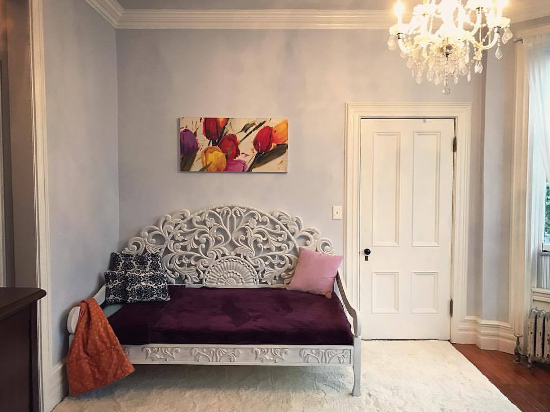 As we are (…slowly) getting the house unpacked and put together, we thought it would be a fun time to go ahead and start sharing our before and after pictures with you! This first room is one of my favorites in the whole entire house. Used as a nursery by the previous owners, this adorable little room off of the Master suite is now my art room, writing area, and guest space. Because my husband is amazing and spoils me endlessly, he has gifted this room to me to use in whatever way I want.