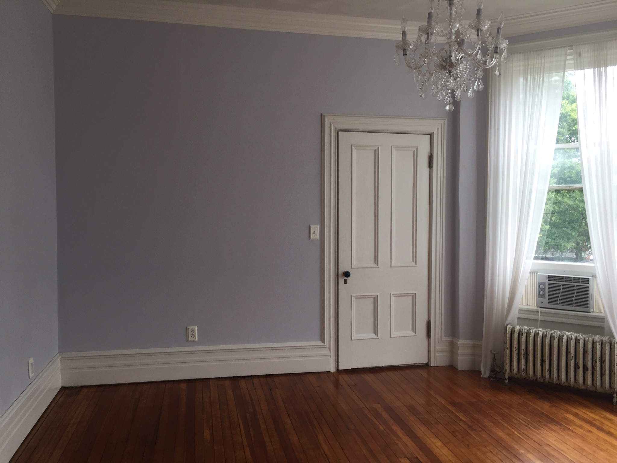 When all was said and done, this lovely space was complete with two chandeliers and a calming periwinkle color.
