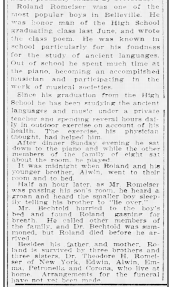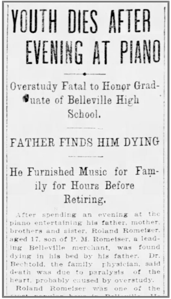As you all know by now, the family that originally owned our house was very well-to-do in the late 1800s. The patriarch, Peter, owned a mercantile store and was very successful. He lived in the house with his wife Elise and their 8 children. In 1906, their 6th child, a son named Roland, had just graduated from high school. He was well known and well loved by the entire town. Very musically inclined, not only did he raise money for a new piano for the high school, but he composed the graduation song for the Belleville High School senior class of 1906
